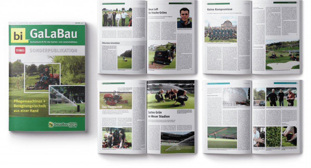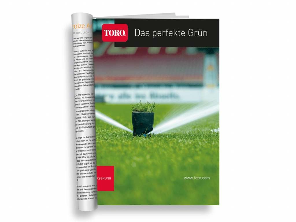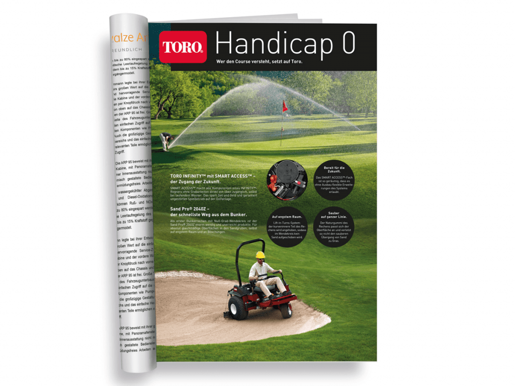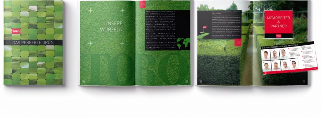 Eine Imagebroschüre der besonderen Art sollte es werden – das hatte sich die Werbeagentur wyynot aus Karlsruhe vorgenommen. Weg vom eintönigen „wir über uns“. Weg von einer Produktschlacht, die morgen schon veraltet ist. Weg von nichtssagenden Bildern und Texten. Hin zum reinen Grün. Denn das ist es, was die Zielgruppe mit den Maschinen und Systemen von Toro erzielen will.